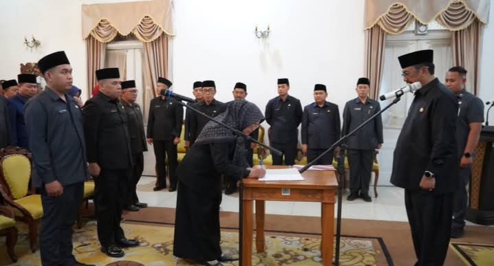 SukabumiLokal | Bupati Sukabumi H Asep Japar mengukuhkan dan mengambil sumpah janji/jabatan manajerial di Lingkungan Pemerintah Kabupaten Sukabumi yang dilaksanakan di Pendopo Sukabumi, Kamis, (08/01/2026). Hal itu pasca ada perubahan nomenklatur Struktur Organisasi dan Tata Kerja (SOTK) di sejumlah perangkat daerah.