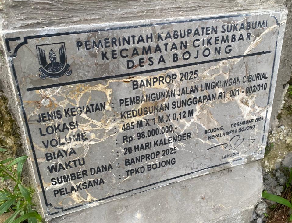Cikembar, SukabumiLokal | Menanggapi dinamika dan perhatian masyarakat terhadap pelaksanaan pembangunan betonisasi jalan lingkungan Ciburial di Dusun Sunggapan RT 001/002 RW 10 Desa Bojong, Kecamatan Cikembar, Kabupaten Sukabumi, Inspektorat menegaskan pentingnya kepatuhan terhadap perencanaan teknis serta ketentuan peraturan perundang-undangan yang berlaku. Kegiatan tersebut bersumber dari Bantuan Provinsi Jawa Barat Tahun Anggaran 2025.